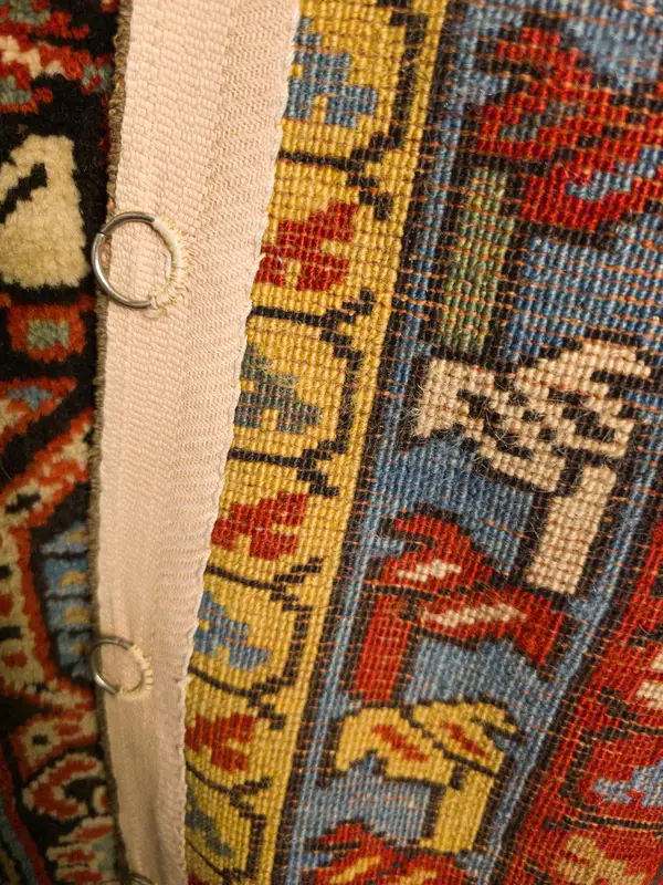 A szőnyeg szegélyét egy finoman megrajzolt, hagyományos kaukázusi bordűr keretezi, amely tökéletes egyensúlyt teremt a mozgalmas belső mező és a nyugalmat sugárzó perem között. A korából fakadó enyhe patina nem vesz el az értékéből – sőt, kifejezetten erősíti a darab antik jellegét és gyűjtői értékét.